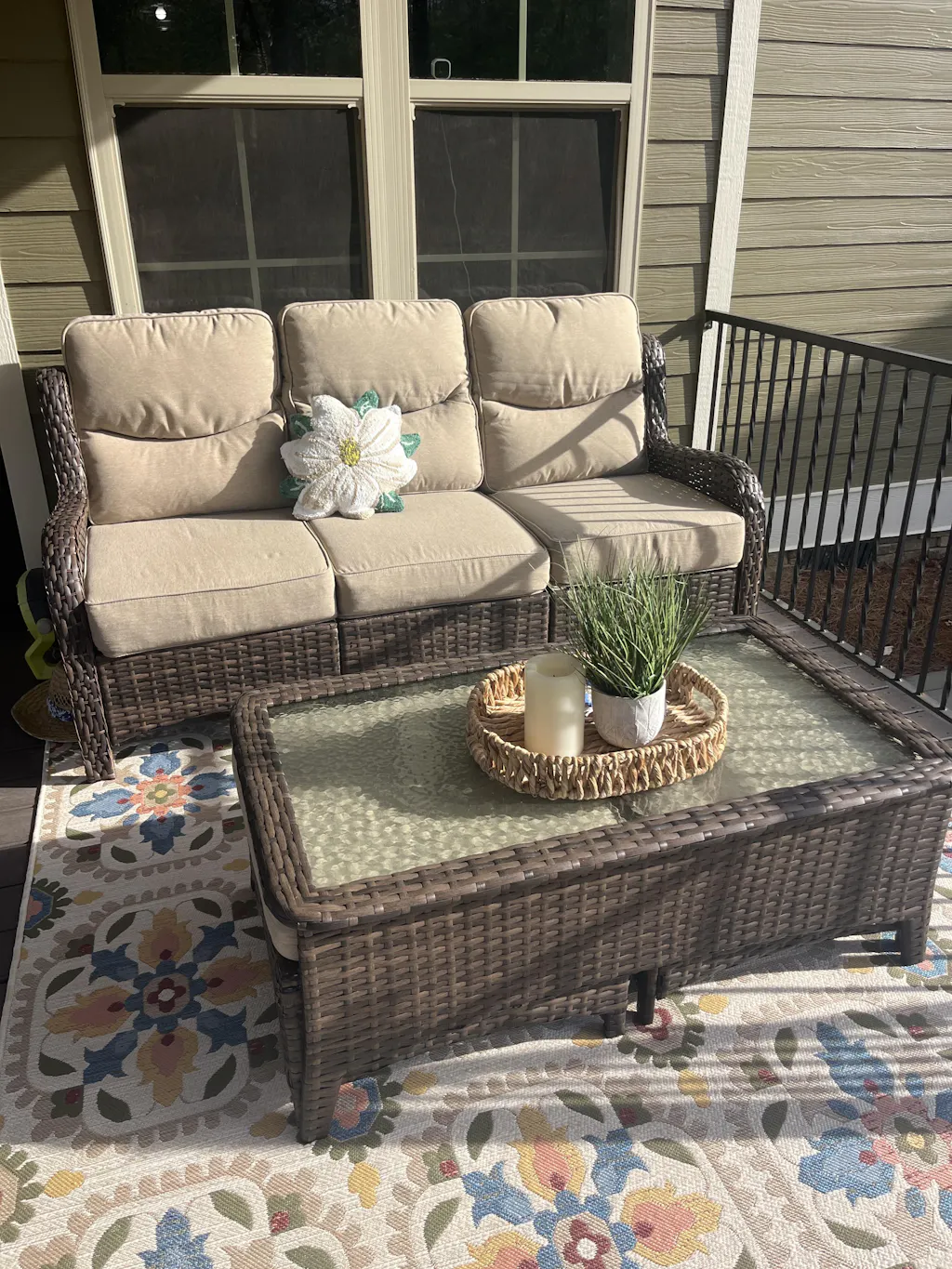 - Handwoven all-weather PE wicker resists rain, UV rays, and everyday wear.